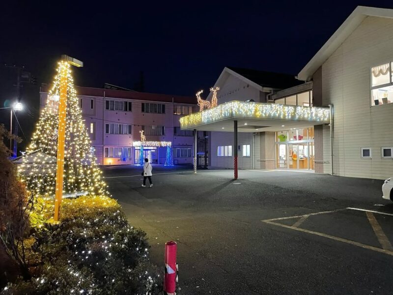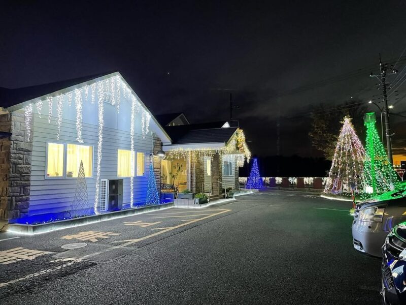 そこではイルミネーションがすごくて、入口の上にトナカイが。