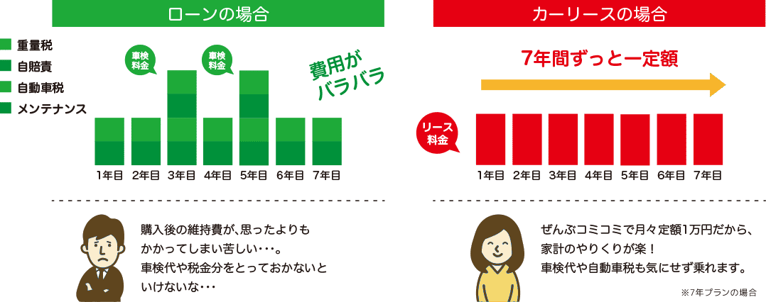 現金・ローンには含まれないご契約期間乗るための車検代や自動車税、オイル交換などの必要経費を含めて分割払いができます。